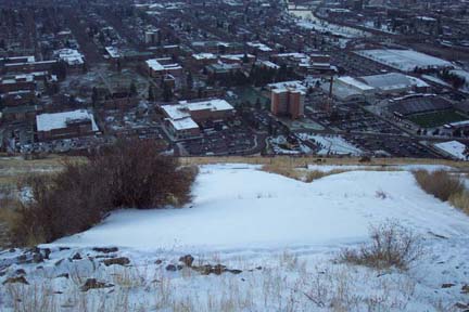 We beat Wilco to the gig, so with some free time as we wait for them to set up, I took a hike up the nearby hill with a giant M at the top. The building in the middle was the gig and if you look hard enough you can pick out the two tour busses in the parking lot.