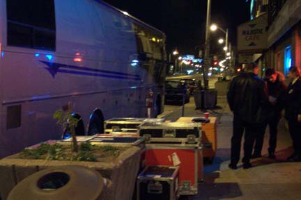 We picked up some lighting equipment at our show in Detroit, only problem was, our bus driver hadn’t gotten the trailer when he was supposed to, so…. Our gear sat on the street with nowhere to put it until a trailer showed up, which was on it’s way, but didn’t arrive till 4 AM. So we sat and waited, well, that is our Tour Manager and Lighting Tech waited as our Roadie and I got some shut eye. Next morning our bus driver asks for a trailer repack to distribute the weight a little better. I guess we couldn’t expect the guys to do a great job at 4 in the morning 😉