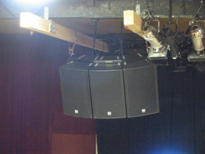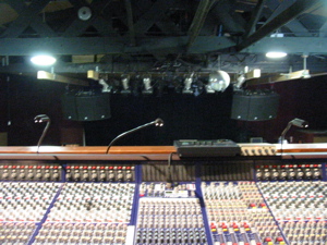 Well, with all the good gear at FOH there is one sort of big downside, your in the balcony, and the boxes are angled at the floor, which they cover really well, we hope to get some fills on top of the pa someday to cover the balcony mix position, just some horns would do the trick, we could angle the boxes up, but then we would need down fill and the majority of the pa would be aimed at the back wall.