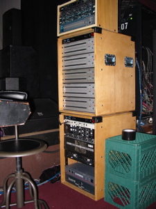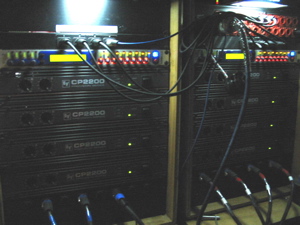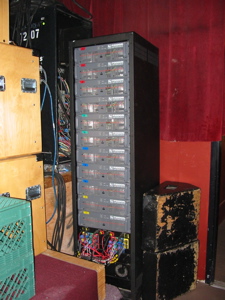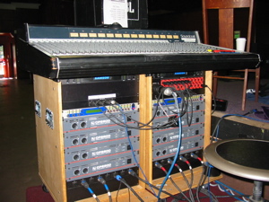 The bottom of the rack has a clear-com station, an Ashely x-over for the sidefills, some QSC amps for the sidefills, a spare EV amp, and the power supply for the Soundcraft.